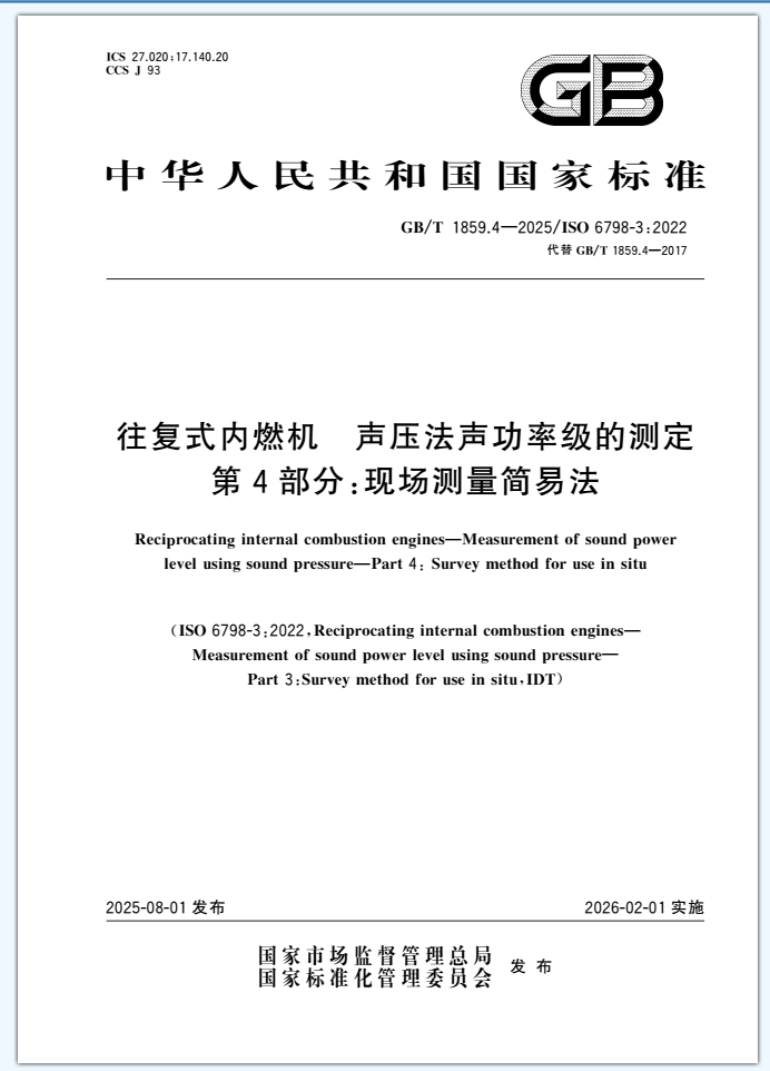 本文件规定了往复式内燃机声功率级的测定方法——现场测量简易法。 本文件适用于ISO 3046-1适用范围的往复式内燃机,以及尚无合适标准可使用的其他内燃机。 注:本文件中,除特殊说明外,往复式内燃机简称“发动机”。