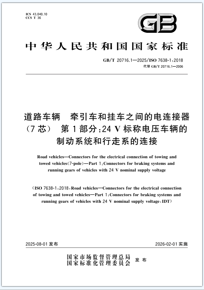 本文件规定了标称电压为24 V的牵引车和挂车之间制动系统和行走系的7芯电连接器的尺寸特性、接点分布、试验和要求。还进一步规定了当插头和插座分离时,用于存储插头的存放插座。 本文件适用于标称电压为24 V的N类牵引车,其他车辆参考使用。