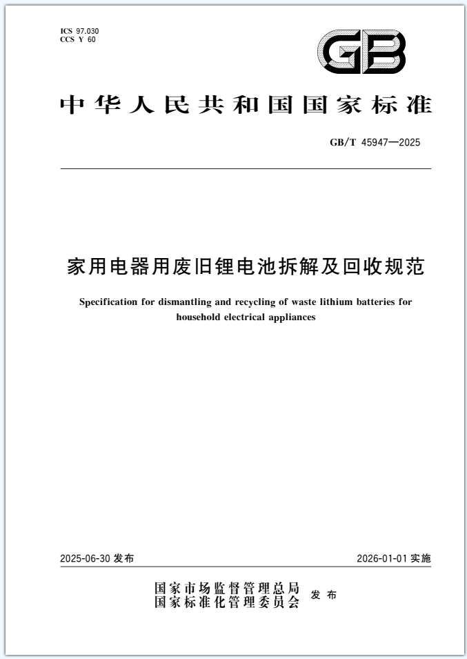 本文件规定了家用和类似用途电器(简称“家用电器”)用废旧锂电池拆解回收的总体要求、人员要求、场地要求、贮存要求以及流程要求。 本文件适用于家用电器用废旧锂电池拆解回收全过程。