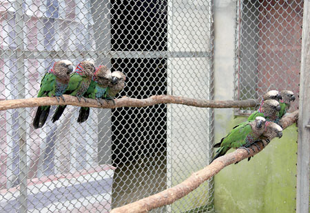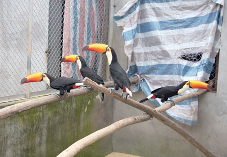 在位于杭州富阳郊区的指定隔离场里,我们见到了这些远道而来的神秘“客人”。小巨嘴鸟性格比较活泼,看见有生人来了就上蹿下跳,左右打量着我们。只见它们娇小的身躯上顶着一个个巨大的“嘴巴”,特别引人注目,“嘴巴”的颜色也很鲜艳,由棕红、明黄和淡蓝3种颜色组成。“别看这种鸟喙很占空间,其实很轻的。”富阳瑞尔动物养殖有限公司总经理贾治民介绍说,鸟喙外面是一层薄薄的角质鞘,里面中空,只有不少细的骨质支撑杆交错排列着。与小巨嘴鸟一墙之隔的是鹰头鹦鹉,身体是鹦鹉常见的鲜艳的嫩绿色,脖子以上却长了个像老鹰一样的脑袋。贾治民说,这是一种非常独特的南美洲鹦鹉,也是唯一会把整个颈部以上的冠羽如伞蜥蜴般扩展开的鹦鹉。更为奇特的是灰翅喇叭鸟,看起来灰灰黑黑一团、貌不惊人,加上细细的腿,像个黑色棉花球棒,在遇到危险时,却能头朝外围成一圈,发出喇叭一样的响亮的“空空”的鸣叫,以此来吓退敌人。