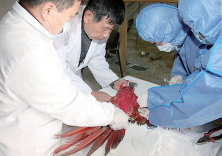 检验检疫人员在隔离场对进境金刚鹦鹉进行检疫采血
