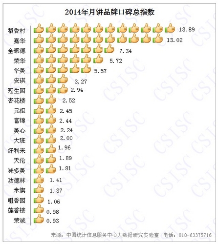 根据数据分析,从2014年月饼行业的品牌网络口碑总体上来看,老字号传统品牌稻香村占据榜首,其次是凭借良好的产品好评度位居第二的嘉华,往精致和简约化方向转型全聚德位居第三;2014年月饼厂家更加注重市场情况,在定价和产量上面有所调整,销售对象更倾向于年轻人,此外对比来看月饼礼盒产量和价格都有所下调。国家统计局中国统计信息服务中心(CSISC)1日联合新华网、中国质量新闻网发布《2014年月饼品牌口碑研究报告》(以下简称《报告》)。共计30个市场表现比较活跃主流月饼品牌,接受了CSISC民意好口碑的公平监测和评价,随着国家免检产品、中国名牌、中国驰名商标等由政府部门认定的“金杯银杯”被国家禁止用于企业宣传,百姓消费参考或将进入大数据下的民意口碑风向标时代。
